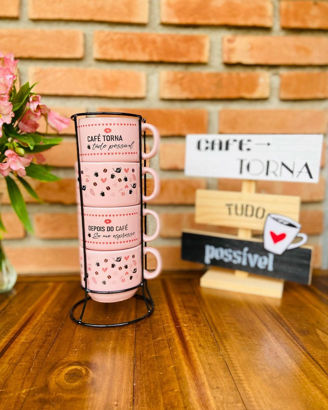 Kit Xícara Empilhável 200ml Rosa Decorada Grãos de Café e Frases (Faixa)