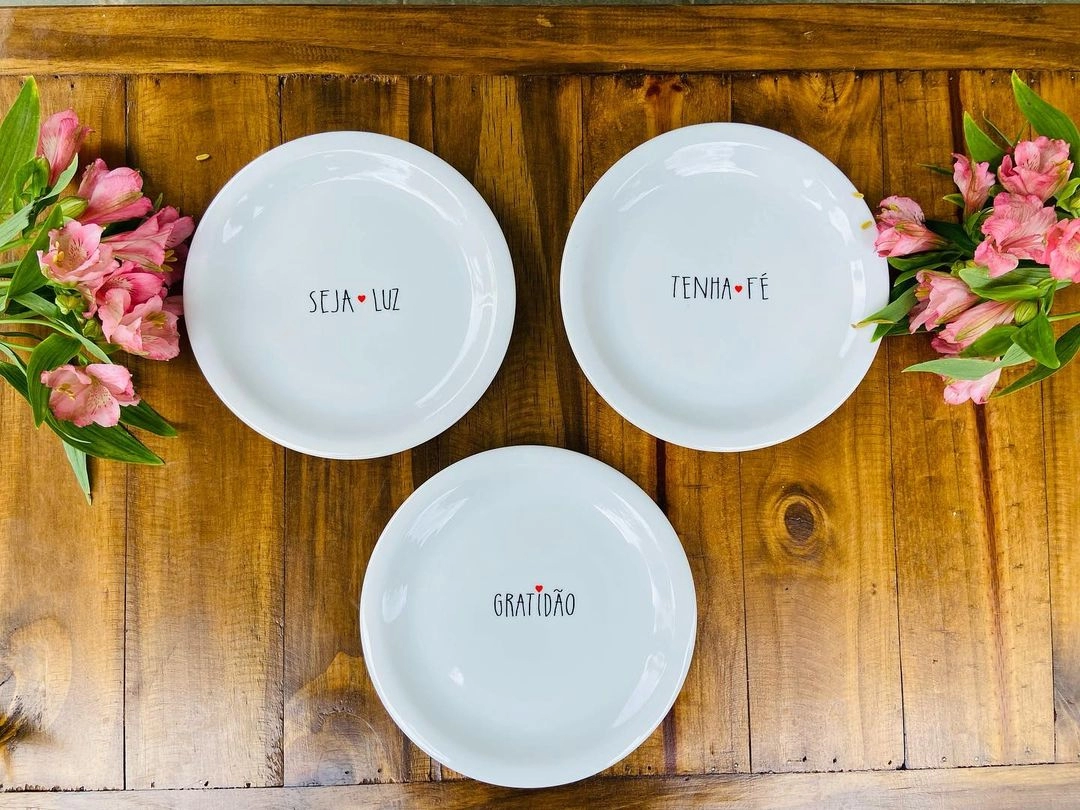 Prato de Sobremesa Decorado 19cm Seja Luz/Tenha Fé/Gratidão Branco