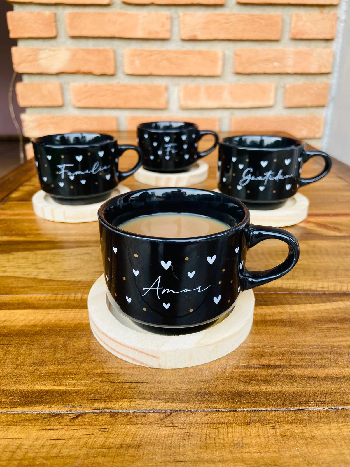 Xícara Chá/Café 200ml Preta Decorada Amor Família Gratidão Fé