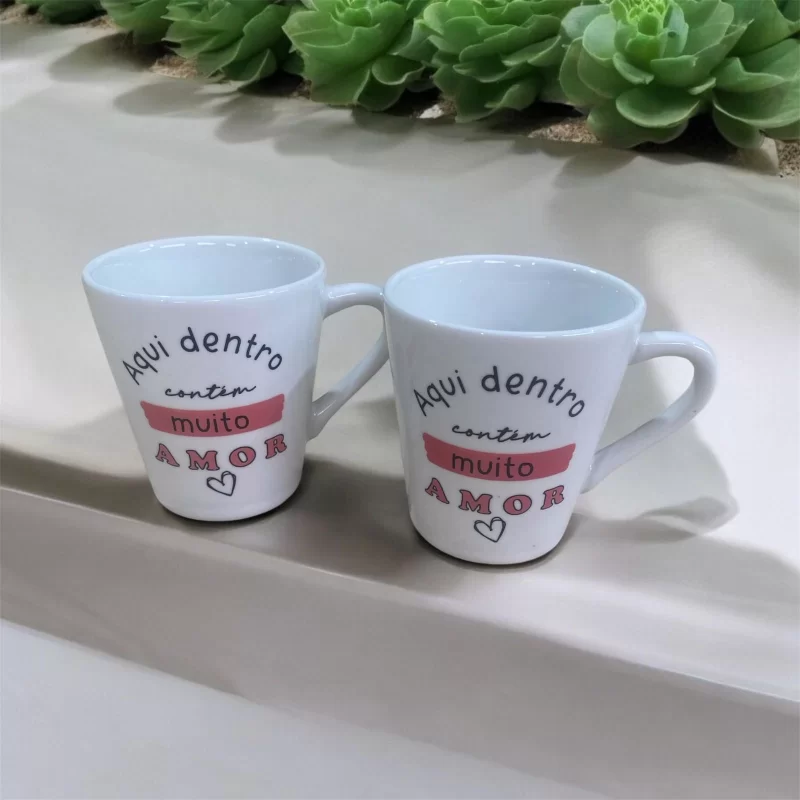 Xícara Cônica 120ml Branca Decorada Frase (Aqui Dentro Contém Muito Amor)