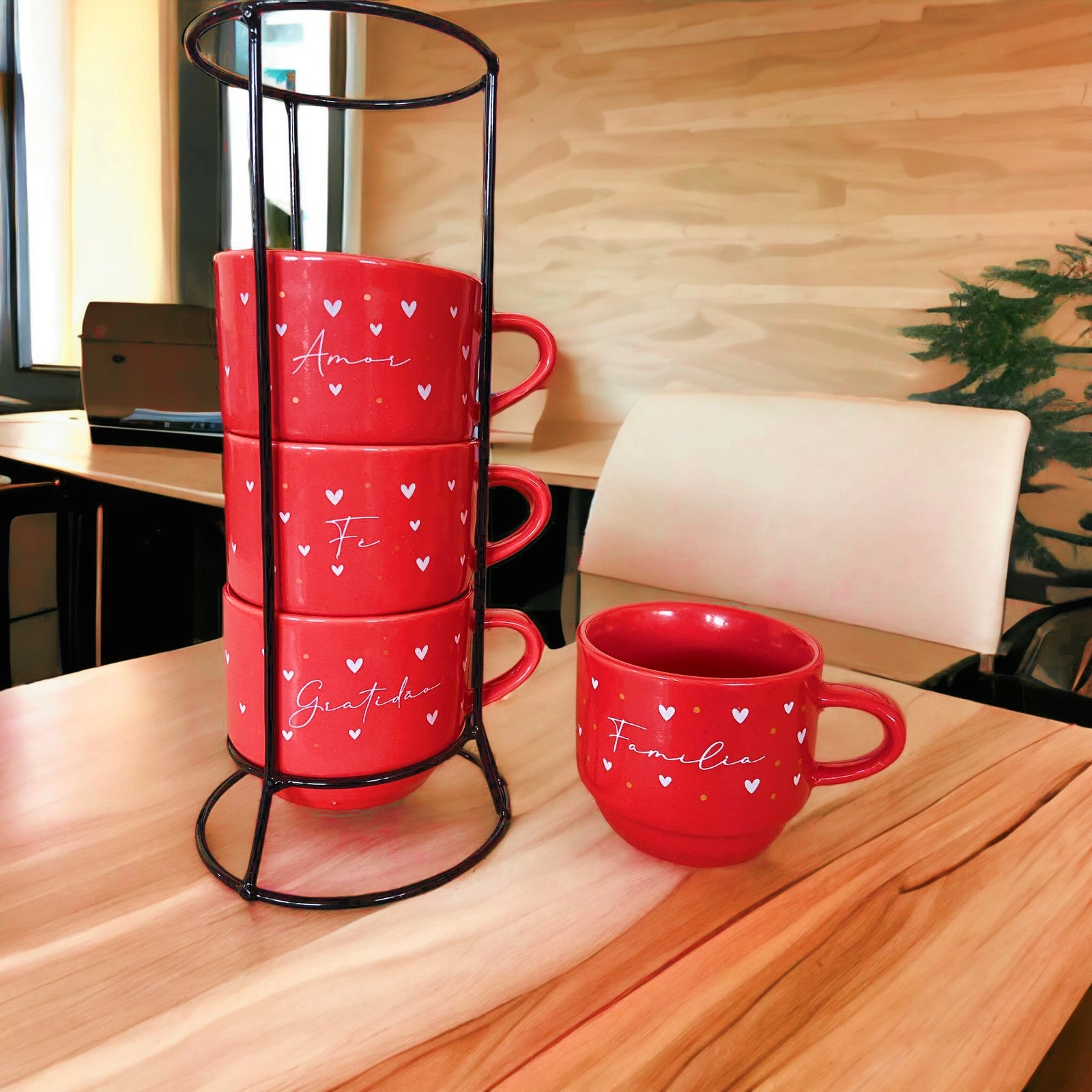 Kit Xícara Empilhável 200ml Vermelha Decorada Amor Família Gratidão Fé (Faixa)