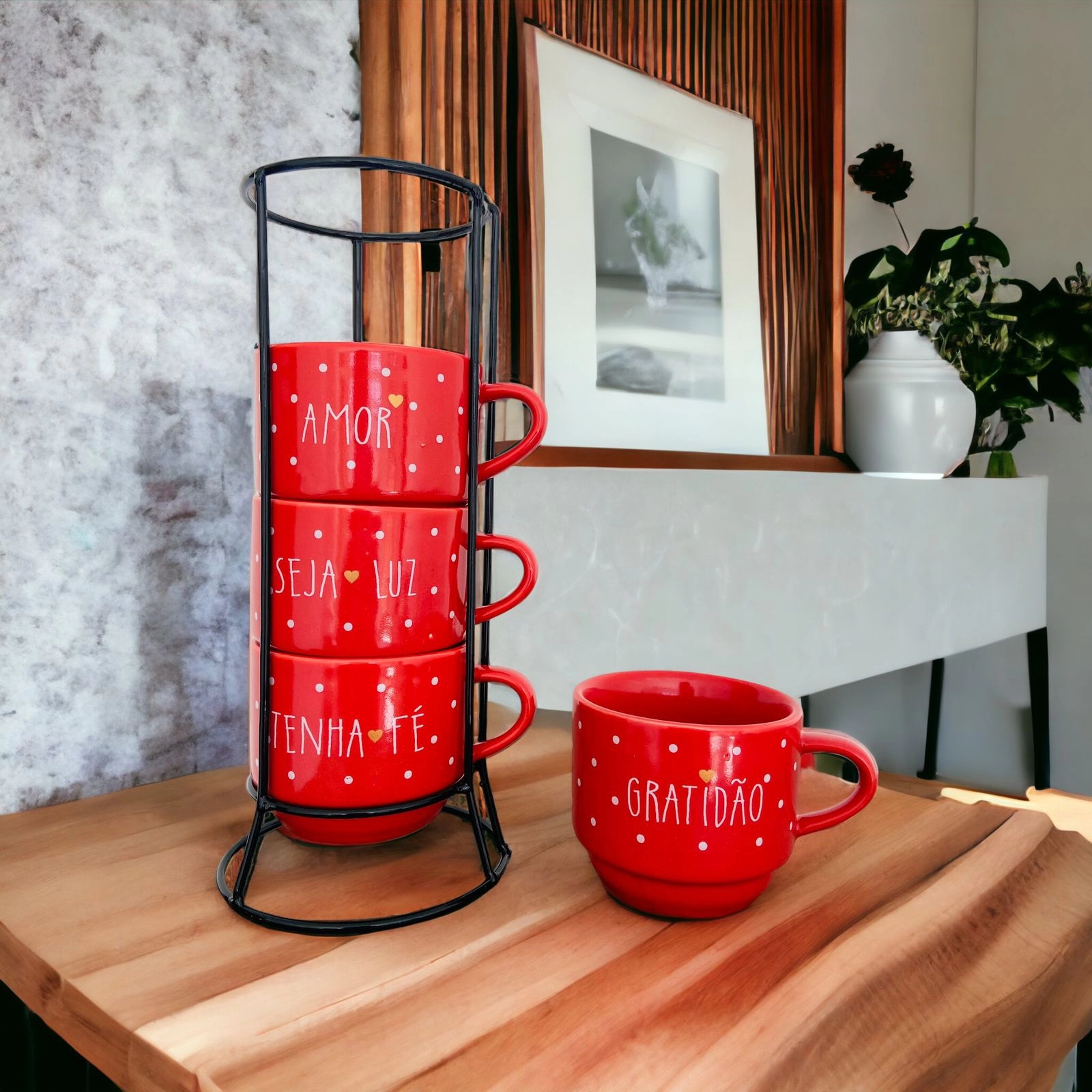 Kit Xícara Empilhável 200ml Vermelha Decorada Poá