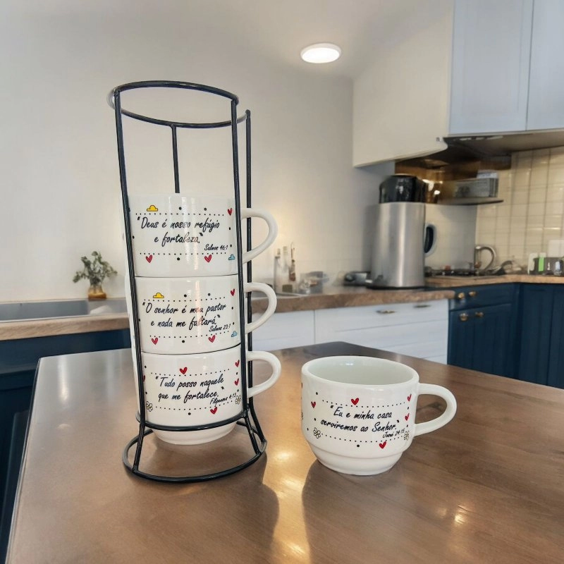 Kit Xícara Empilhável 200ml Branca Decorada Versículos C/4und