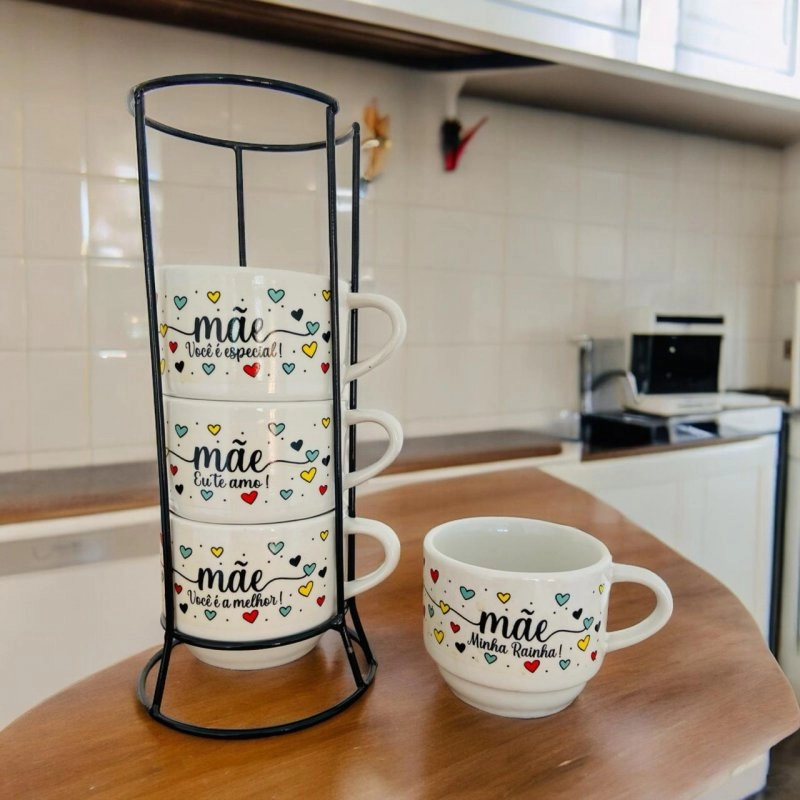 Kit Xícara Empilhável 200ml Branca Coração Colorido Mães C/ 4und
