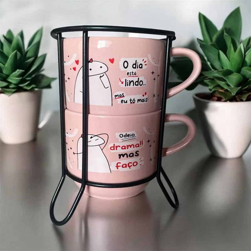 Kit Xícara com 2 Empilhável 200ml Rosa Florks ( O dia está lindo + Odeio Drama)