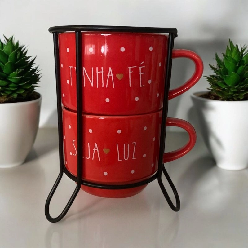 Kit Xícara com 2 Empilhável 200ml Vermelha Poá( Tenha fé + Seja luz)