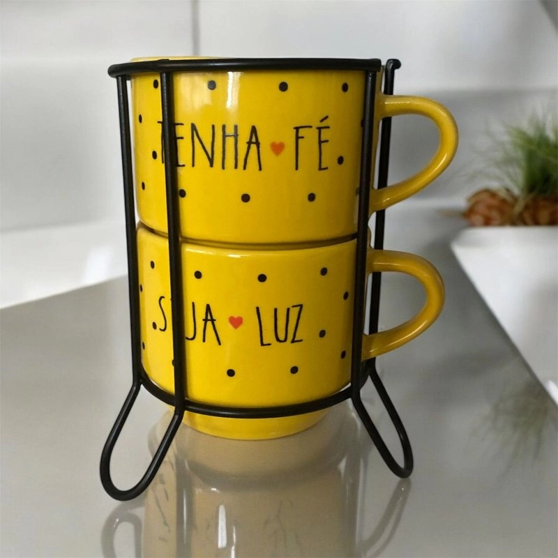 Kit Xícara Empilhável 200ml Amarela Decorada Poá ( Tenha fé + Seja Luz)