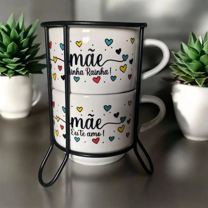 Jogo 5 Kit Xícaras com 2 Empilhável 200ml Branca Coração Colorido Mães ( Minha Rainha Te amo)