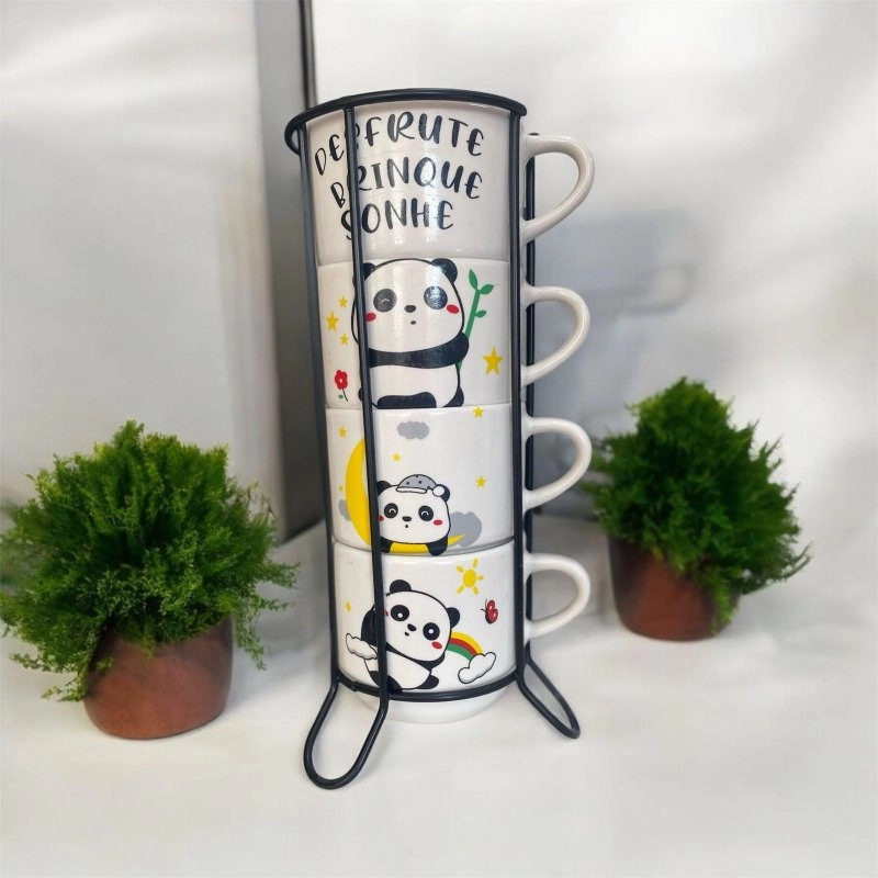 Kit Xícara Empilhável 200ml Branca Panda (Desfrute, Brinque, Sonhe)