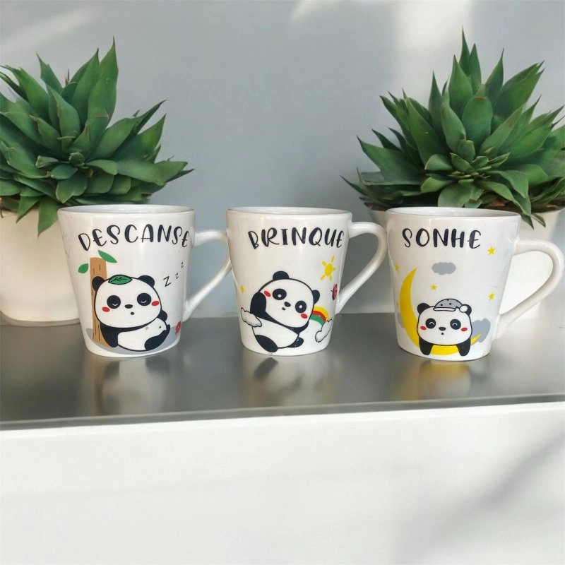 Kit com 3 Xícara Cônica 120ml Branca Panda (Desfrute, Brinque, Sonhe)