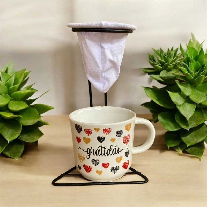 Kit Xícara/Caneca Ágata + coador 200ml Branca Decorada Fé/Amor/Felicidade/Gratidão
