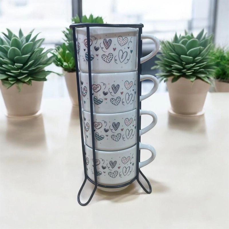 Kit Xícara Empilhável 200ml Branca Decorada Pet's corações