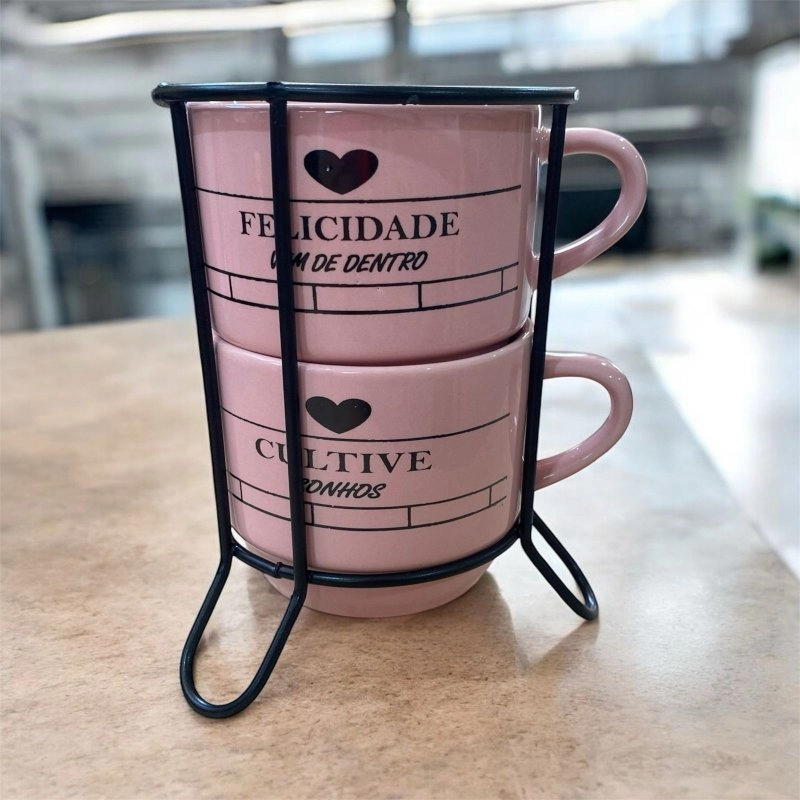 Kit Xícara Empilhável 200ml Rosa Decorada Frases (Faixa) - (Felicidade/ Cultive)