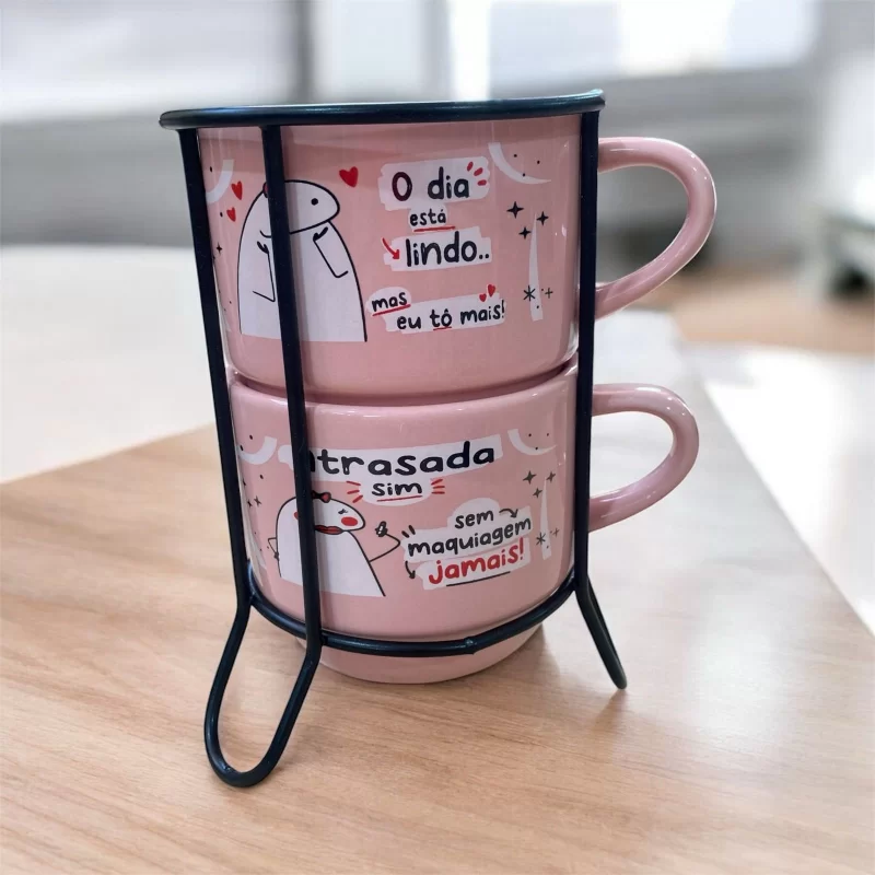 Kit Xícara com 2 Empilhável 200ml Rosa Decorada Florks - ( Dia lindo + atrasada sim)