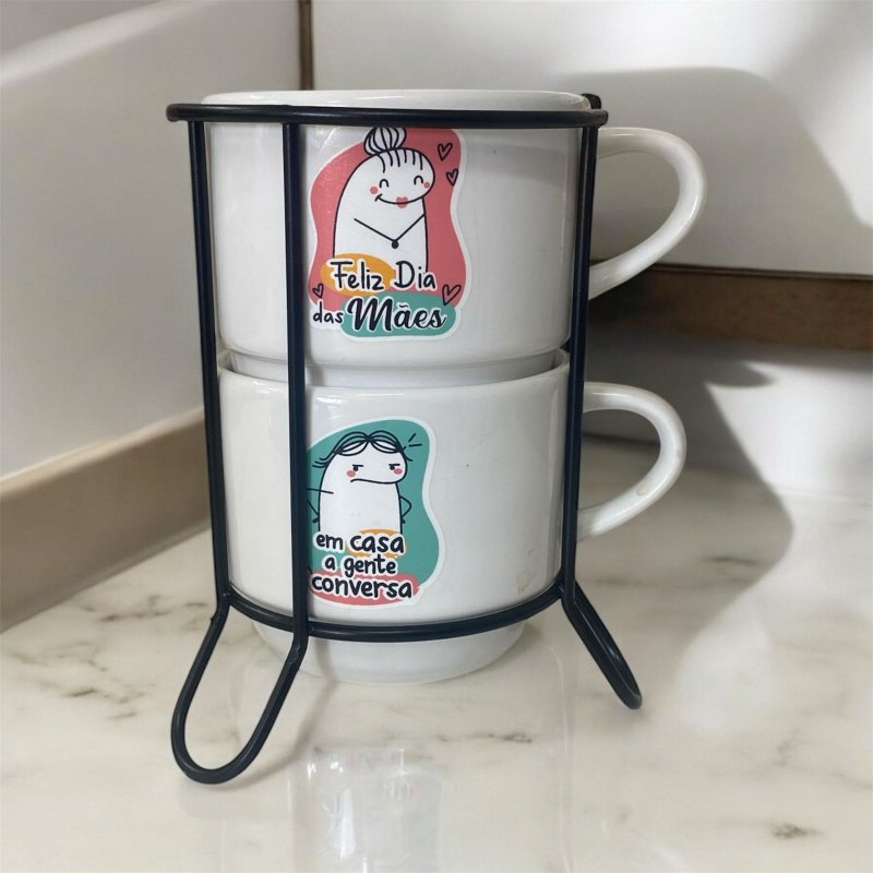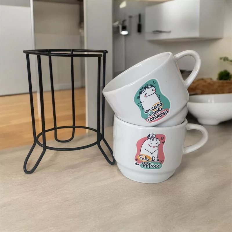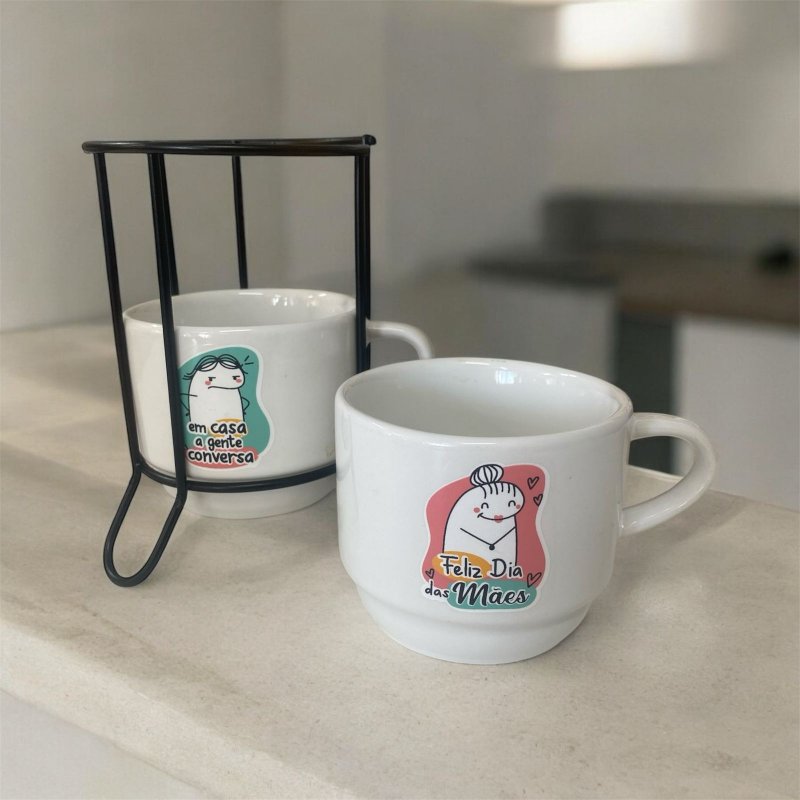 Jogo 5 Kit Xícaras com 2 Empilhável 210ml Cor Branca Decorada - FLORK Mãe em casa a gente conversa