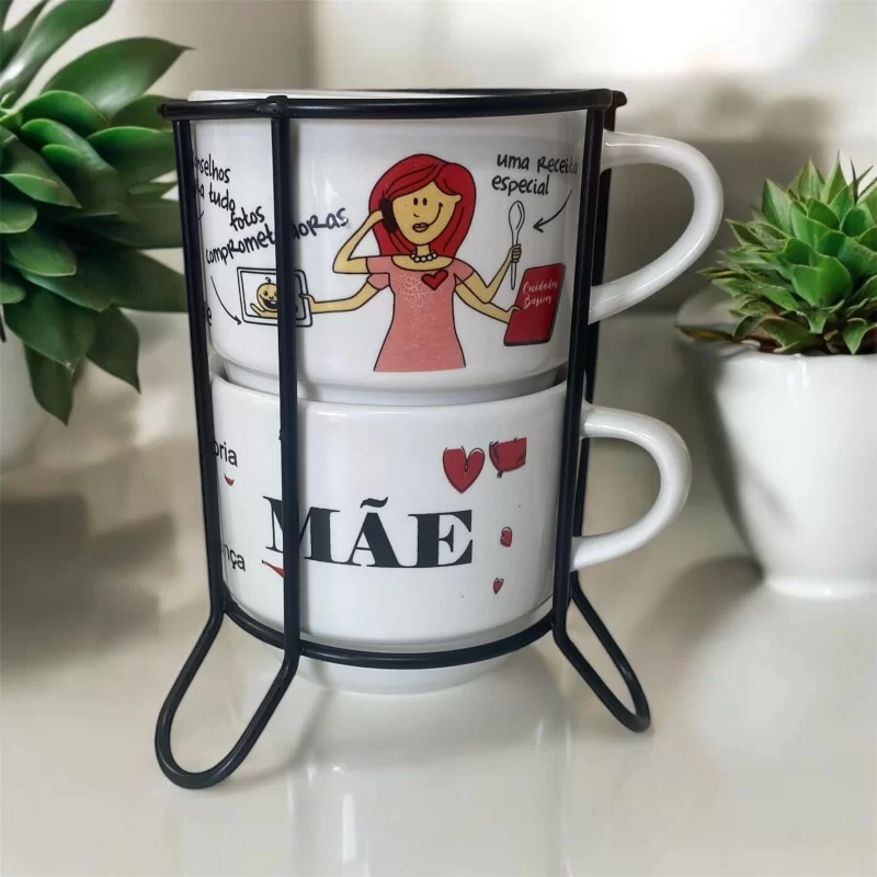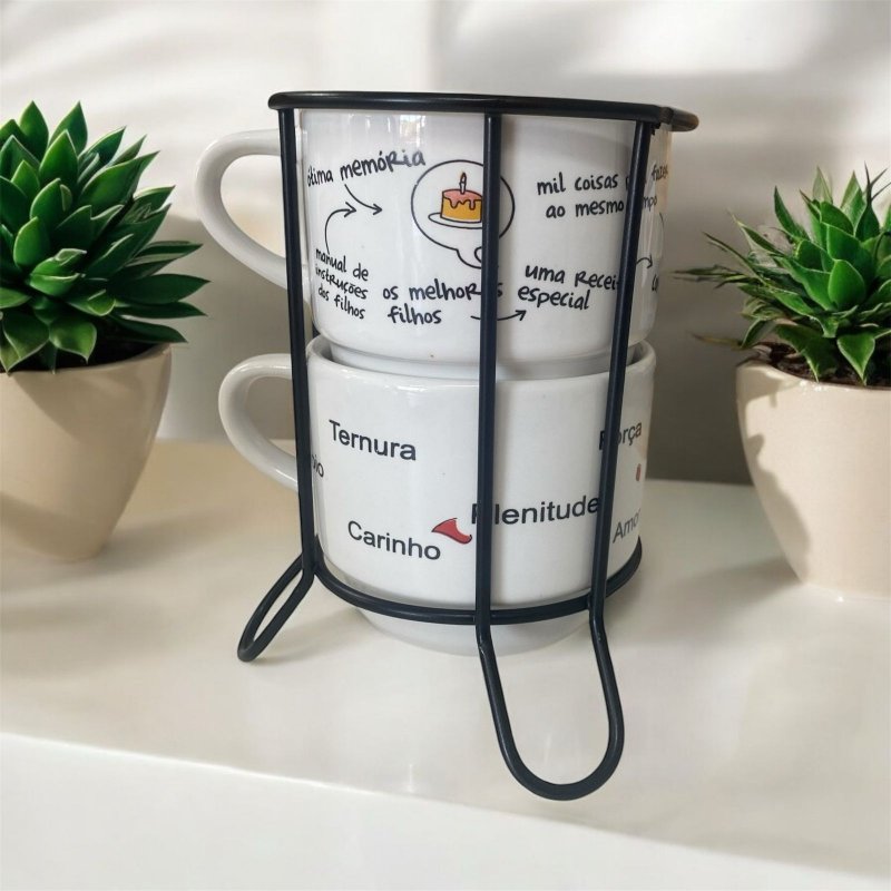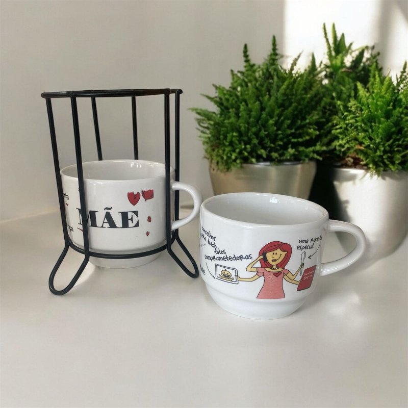 Jogo 5 Kit Xícara com 2 Empilhável 210ml branca decorada (Mãe tarefas)