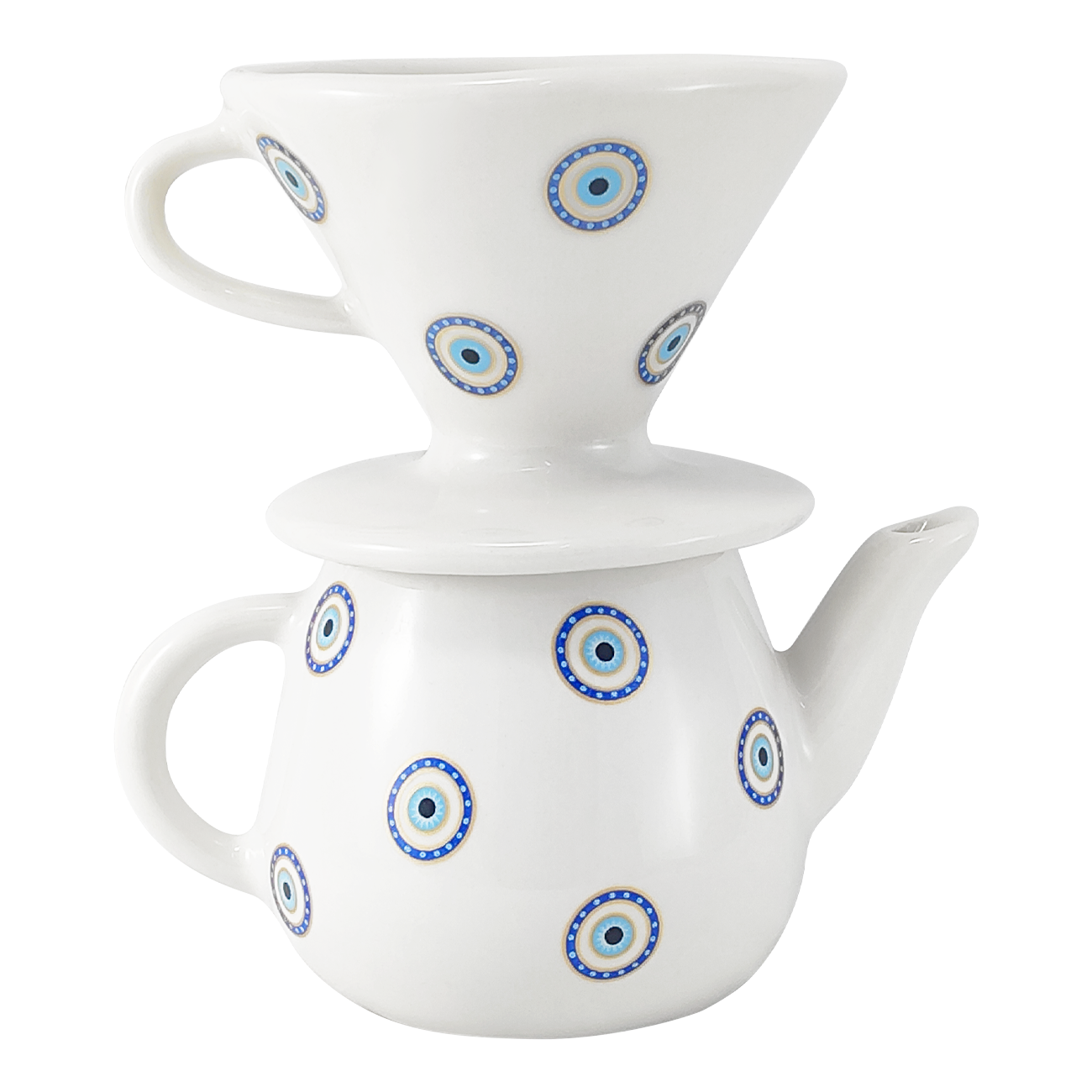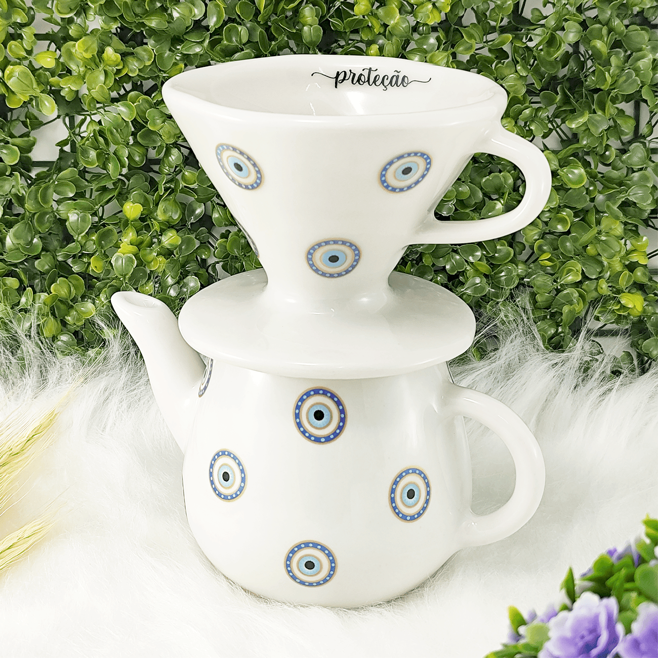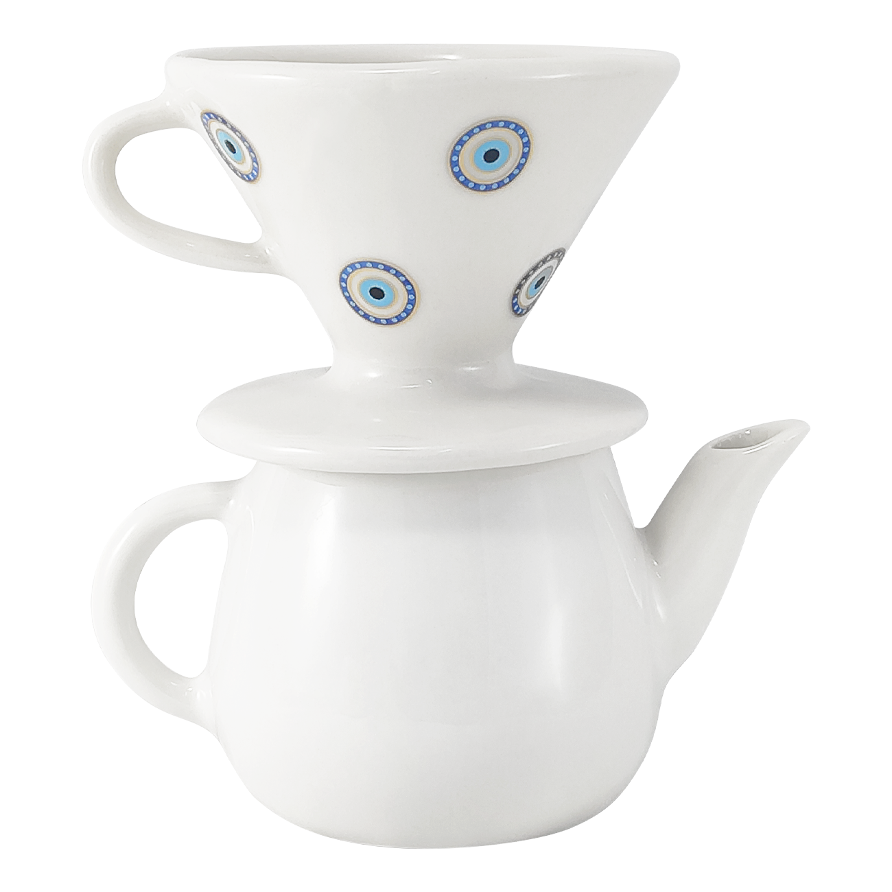 Kit Coador Filtro de Porcelana - Bule De 500 ml Branco Olho Grego