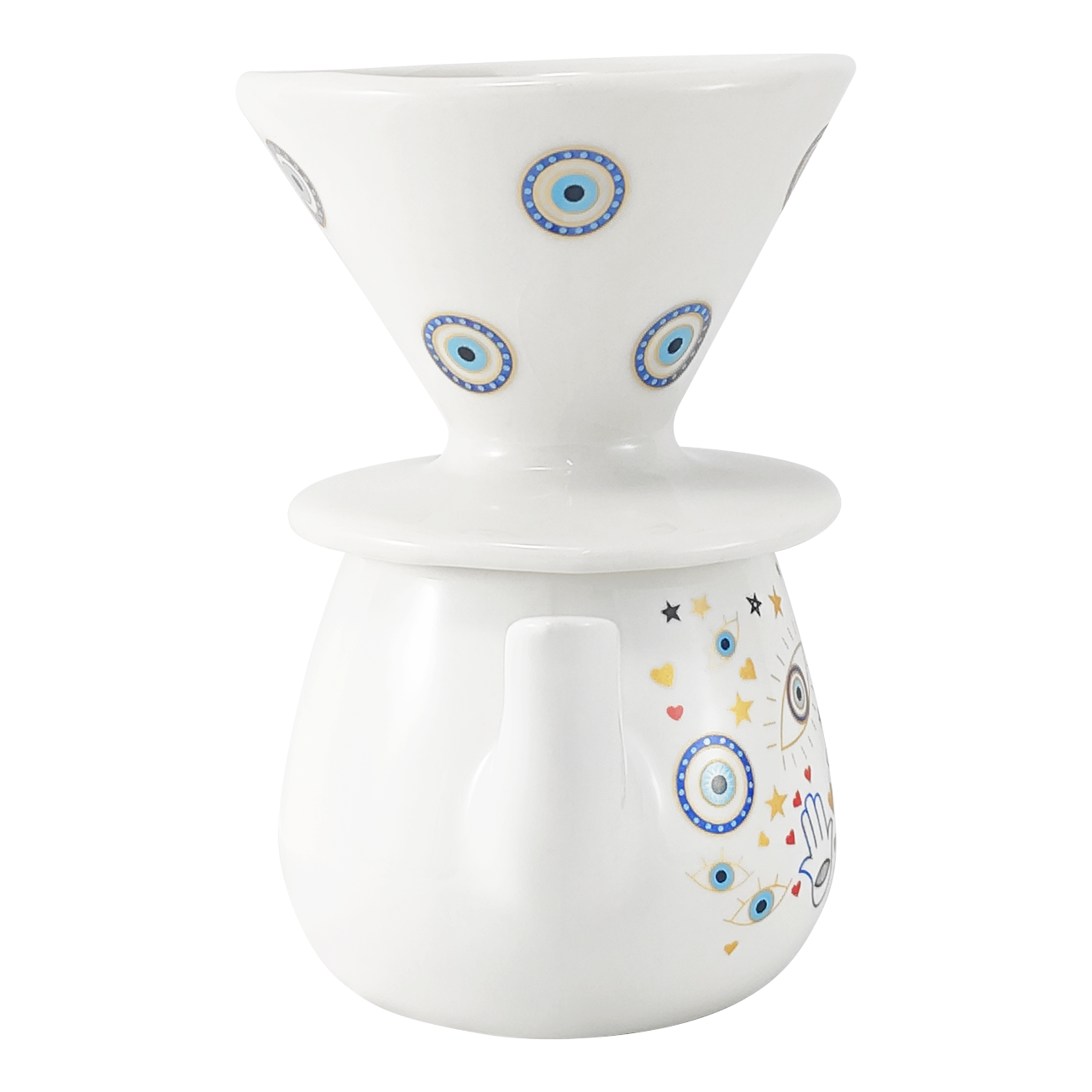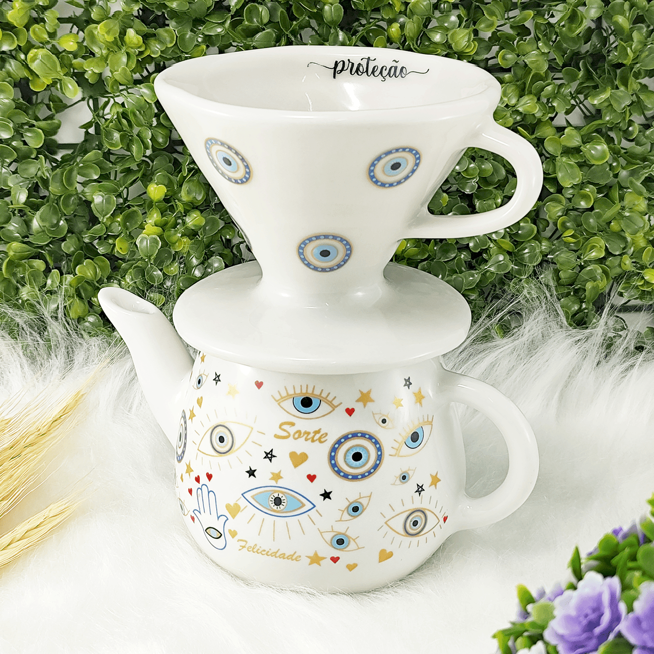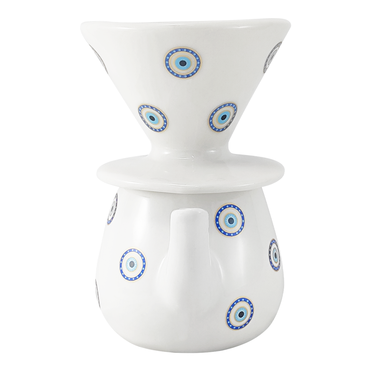 Kit Coador Filtro de Porcelana - Bule De 500 ml Branco Olho Grego