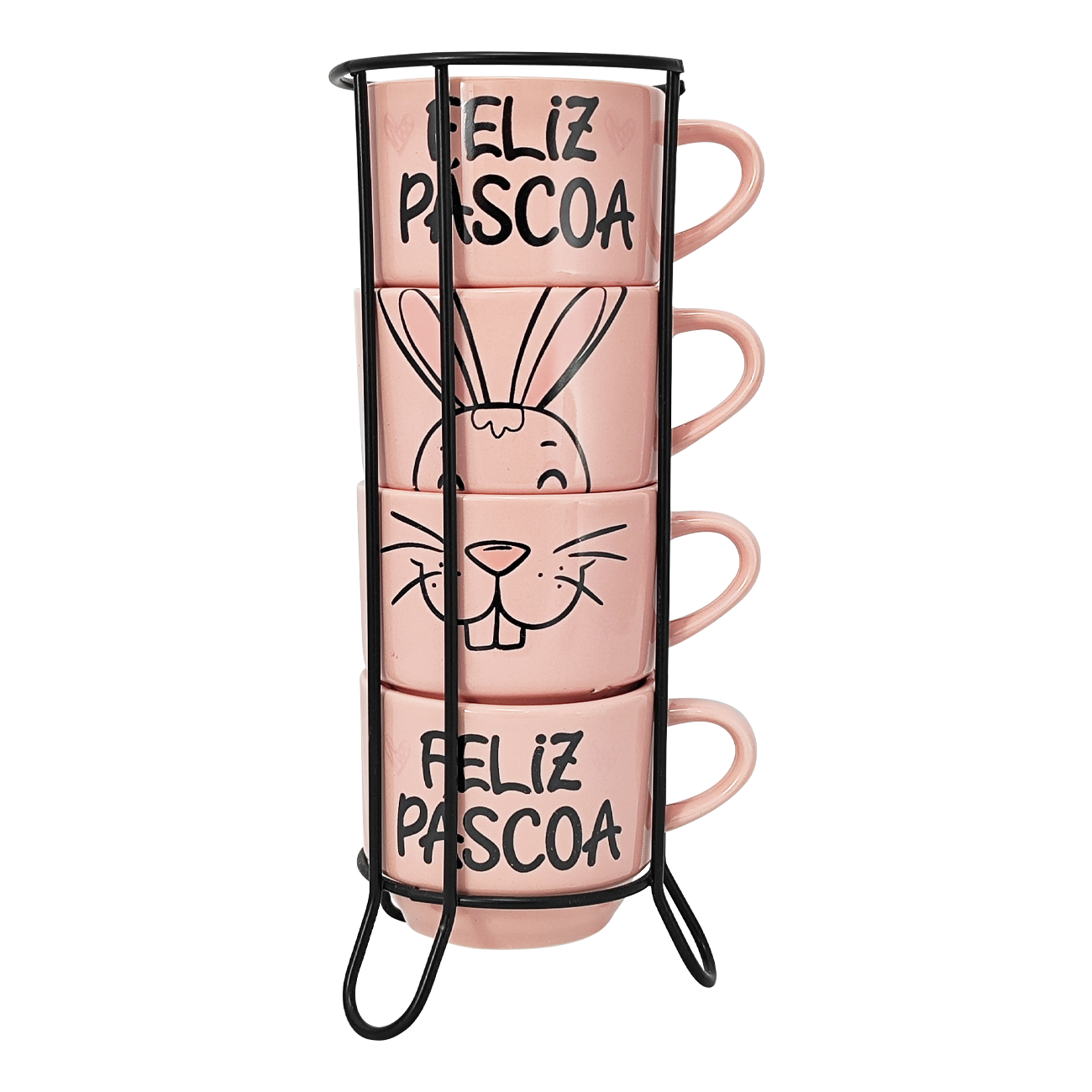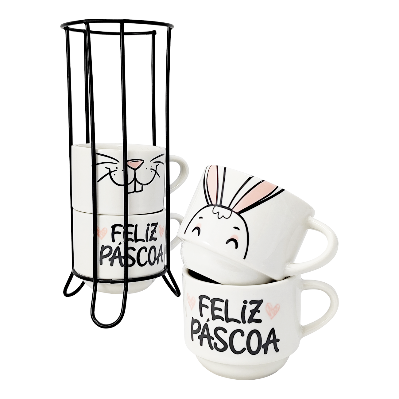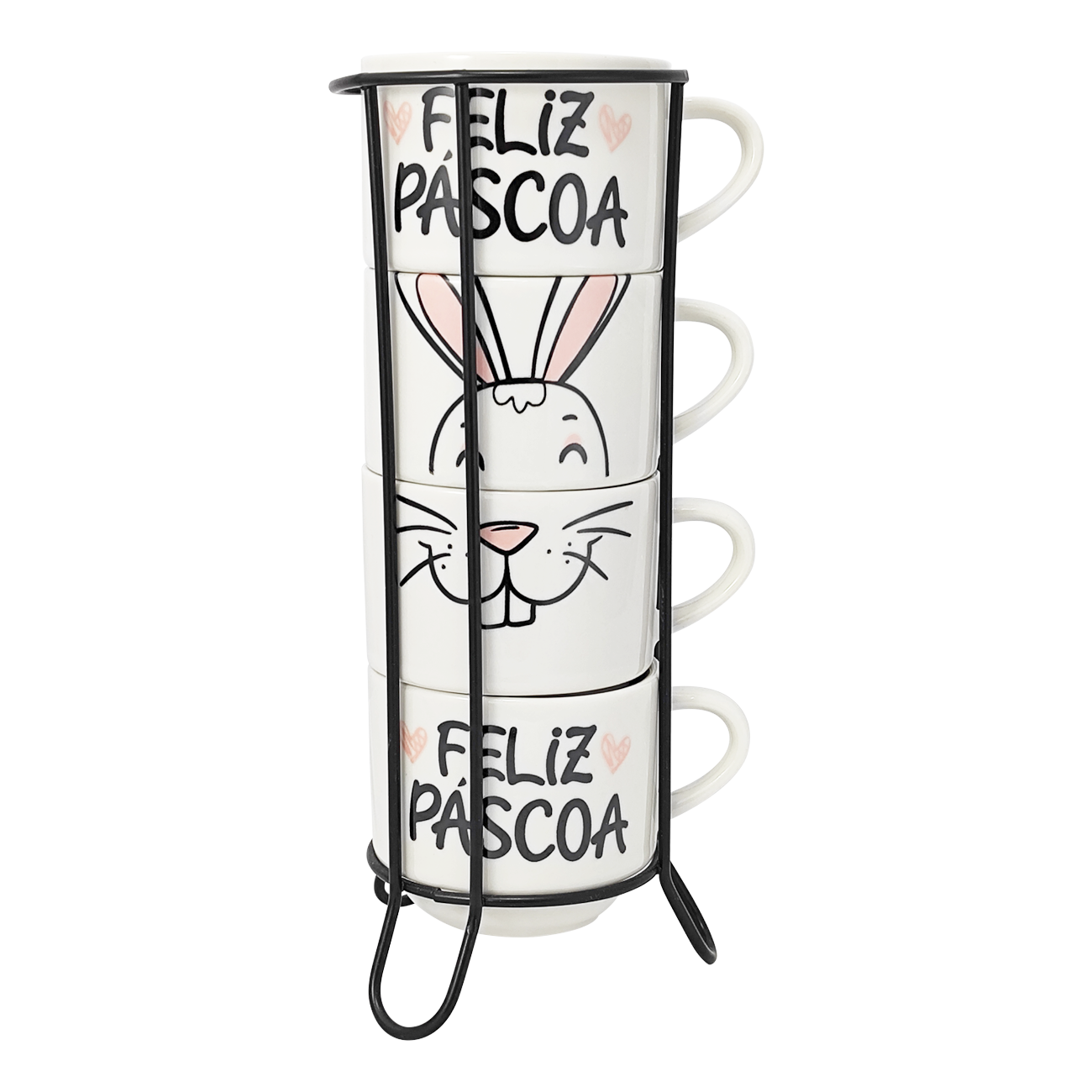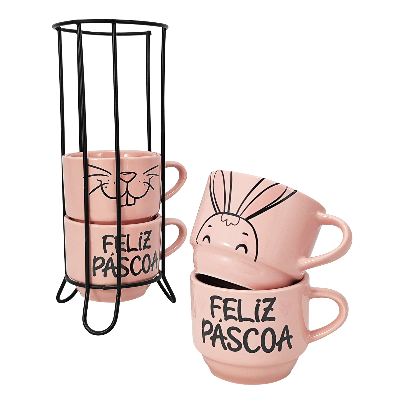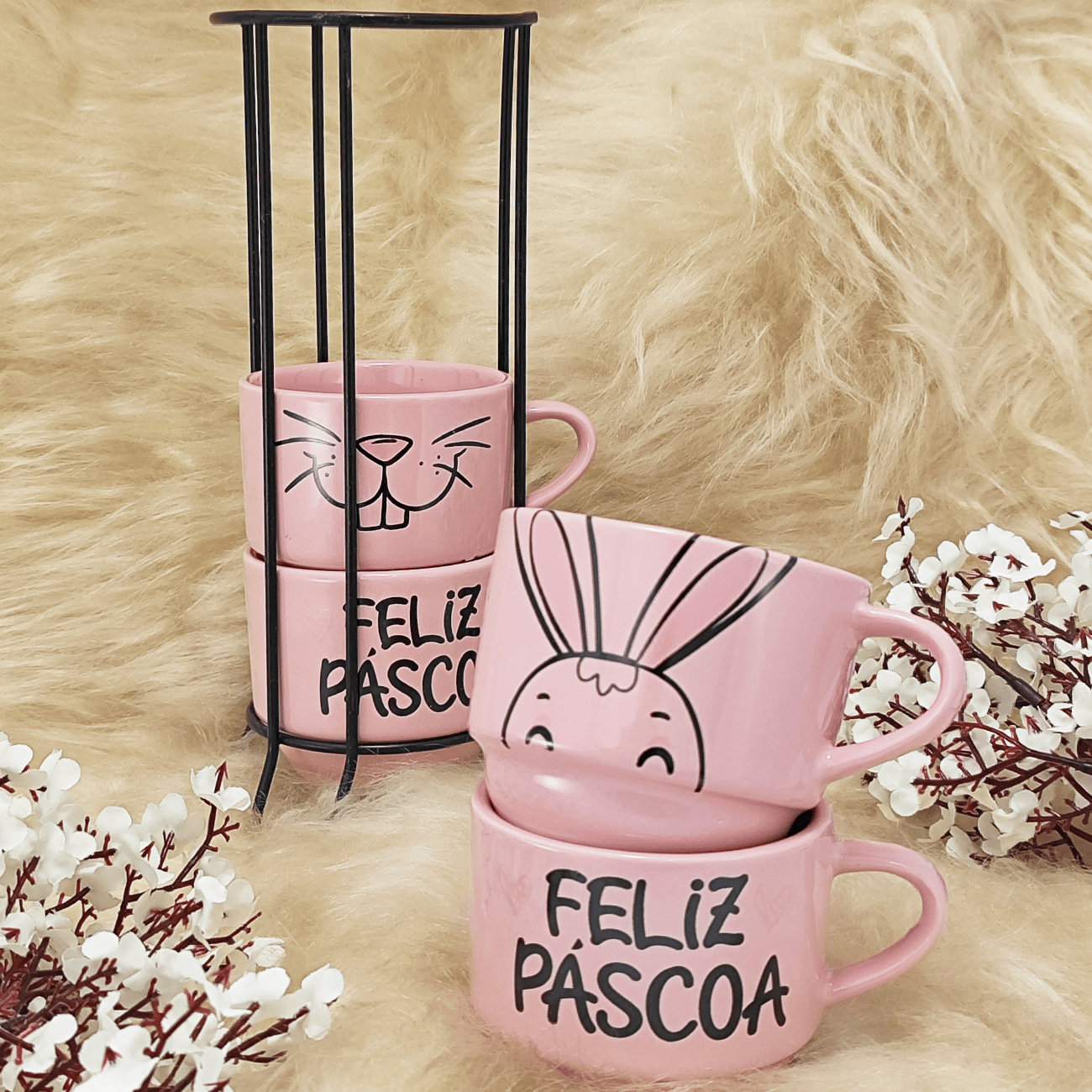 Kit 4 Xícaras Porcelana 210ml Páscoa com variação cor Suporte