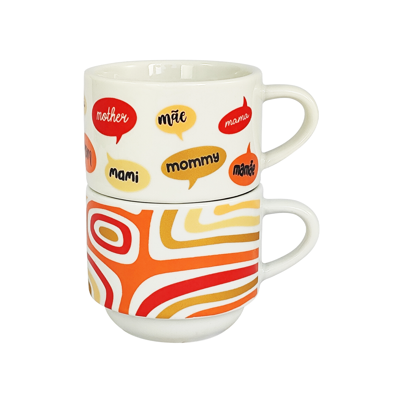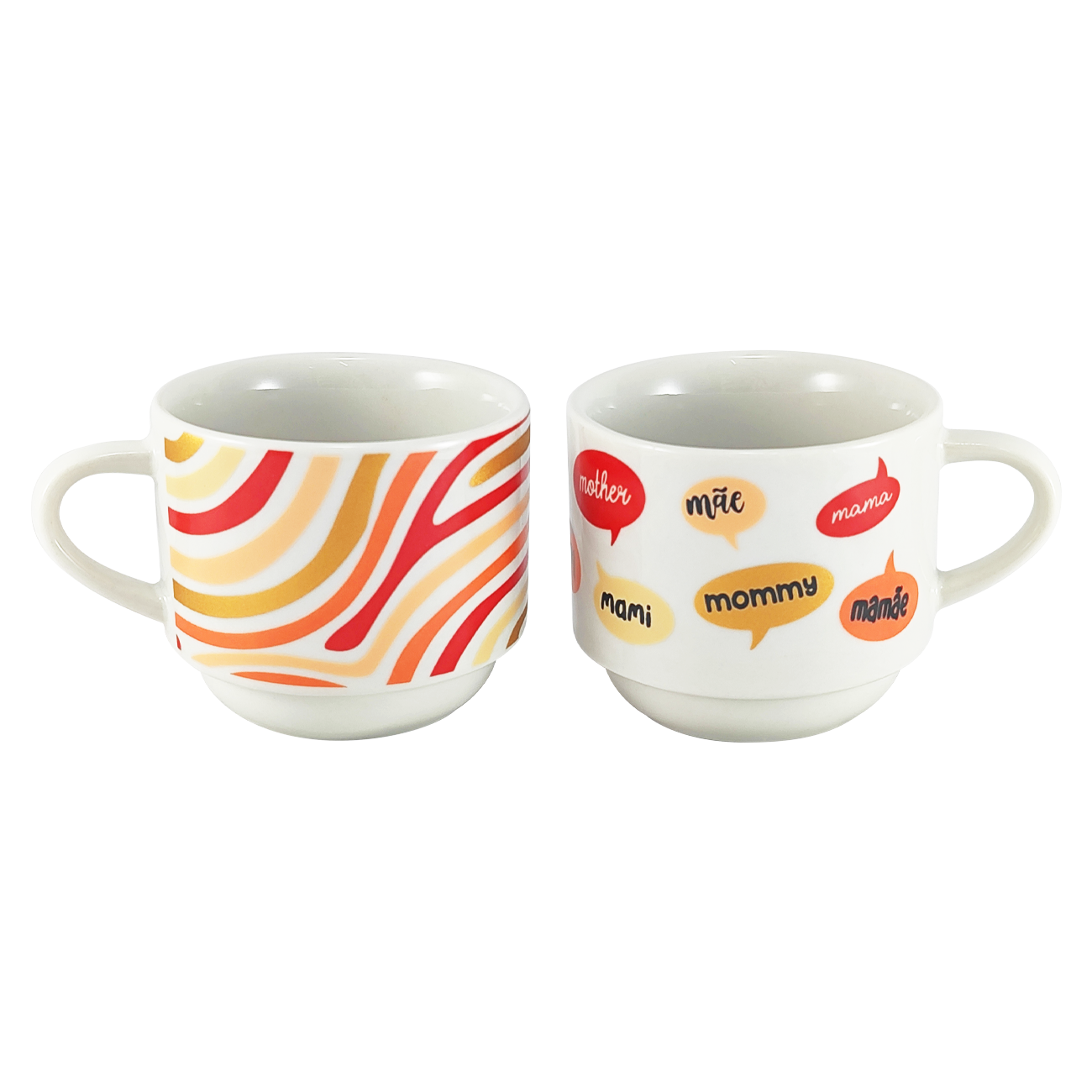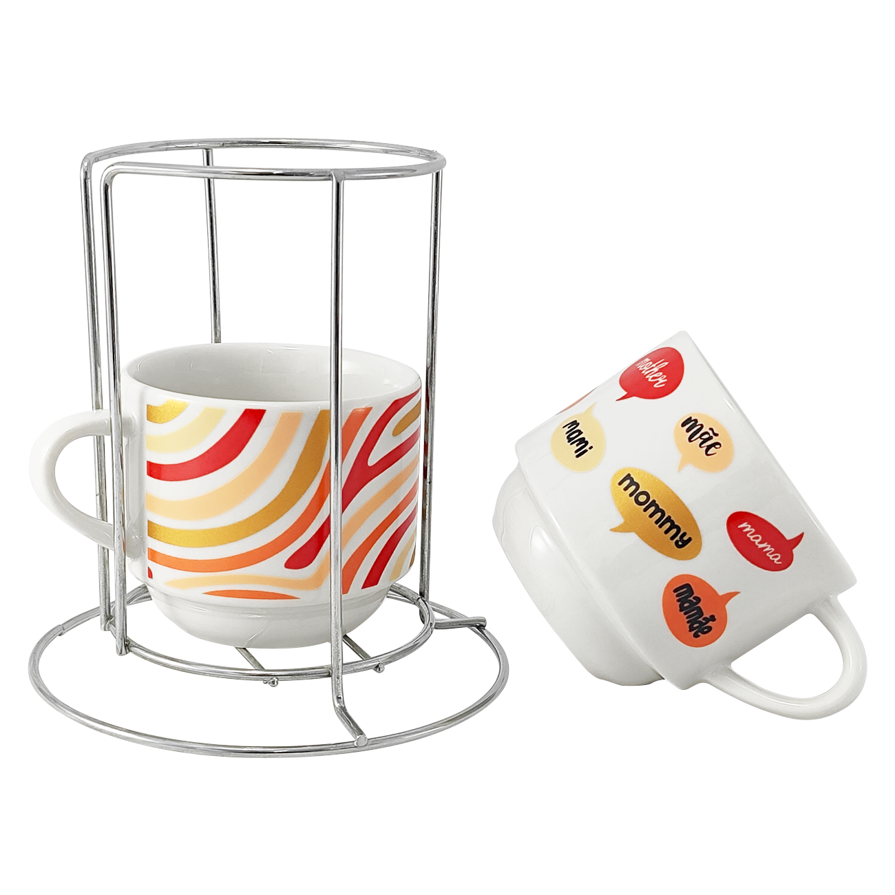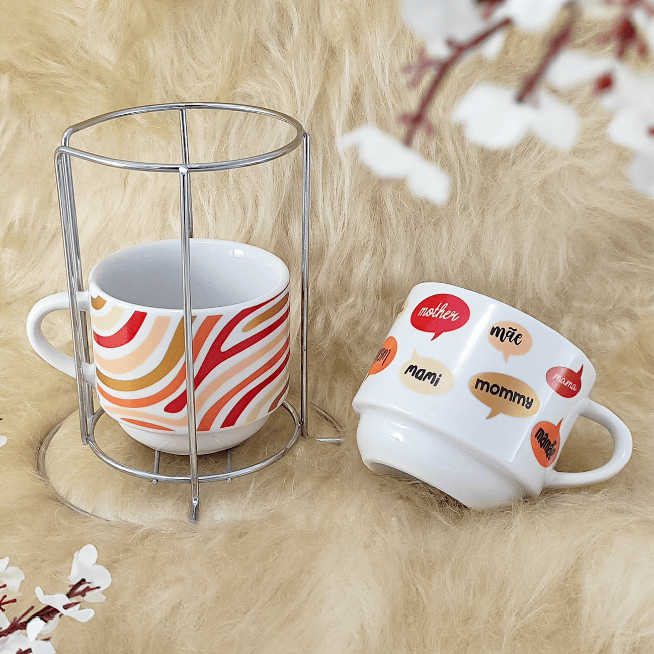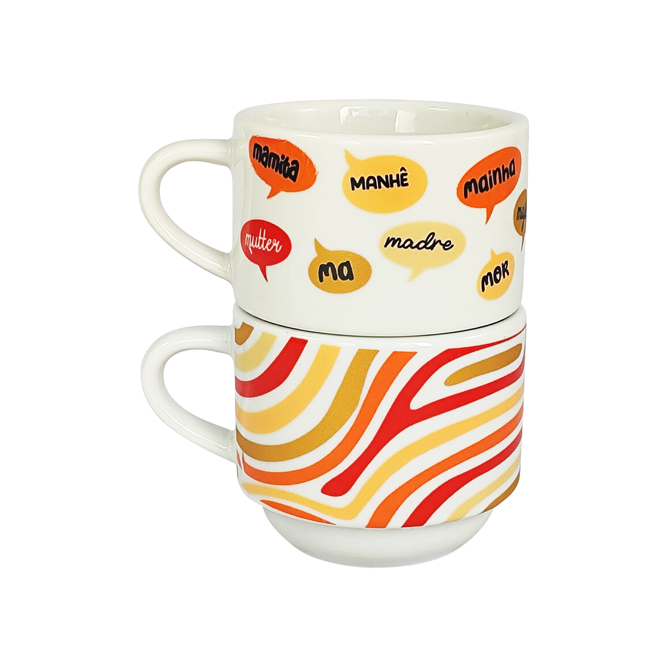 Jogo com 5 Kit 2 Xícaras Empilhável 210ml em Porcelana Branca com suporte café chá Mãe Frases Geométrica