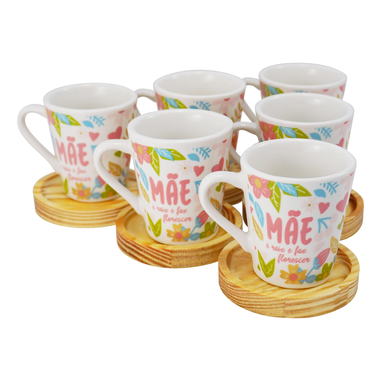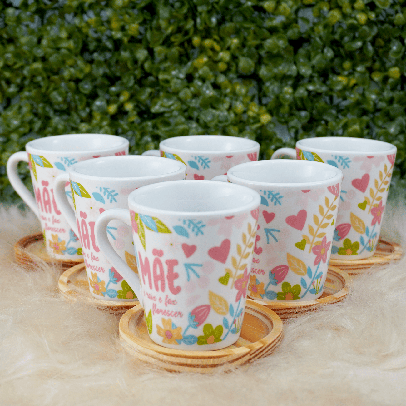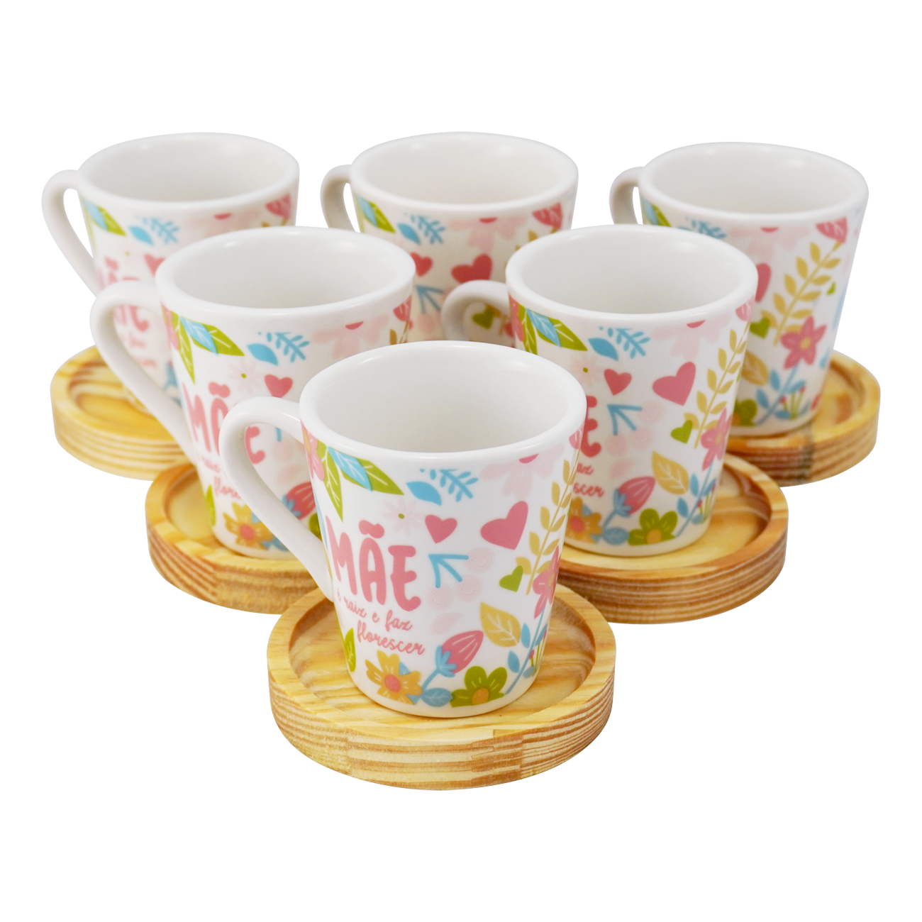 Kit 6 Canecas/ Xicaras Tulipa 120ml Café Porcelana Mãe é Raiz Floral Pires Pinus redondo